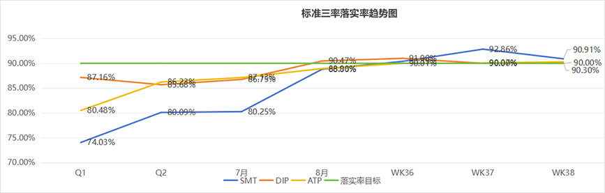 在標(biāo)準(zhǔn)三率落實(shí)率趨勢(shì)圖中,我們欣喜地看到,SMT/DIP/ATP終端團(tuán)隊(duì)以高度的責(zé)任感和使命感,認(rèn)真執(zhí)行三率標(biāo)準(zhǔn),積極地整改存在的問(wèn)題,落實(shí)率在逐月提高,目前已全部達(dá)成目標(biāo)值。這些成績(jī)的取得,離不開(kāi)每一位員工和領(lǐng)導(dǎo)層的辛勤付出和不懈努力。10月期望各車間向95%大關(guān)邁進(jìn)!