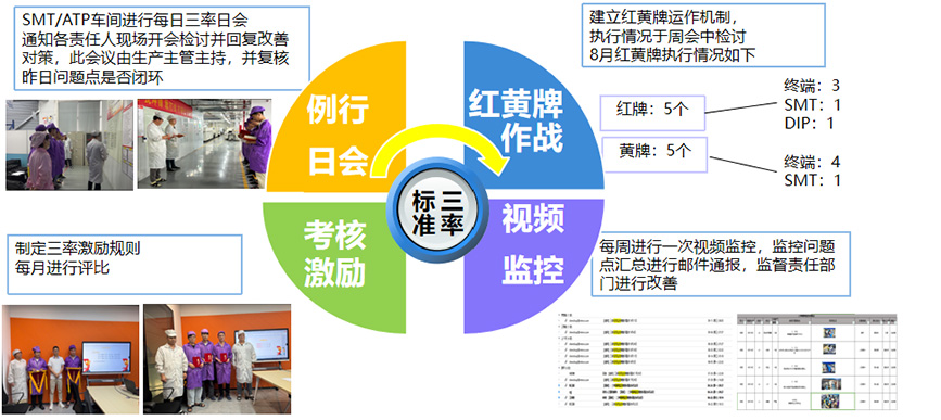 終端車間不僅有每日三率專員的二級(jí)稽查、還建立了各種維度的專項(xiàng)稽查如近期的文件排雷、紅黃牌作戰(zhàn)、視頻監(jiān)控等,并舉行三率例行日會(huì)和周會(huì)檢討發(fā)生的問(wèn)題點(diǎn)并進(jìn)行整改。同步制定了三率激勵(lì)機(jī)制,以保證員工落實(shí)標(biāo)準(zhǔn)三率的積極性,保證工廠標(biāo)準(zhǔn)三率有效改善!